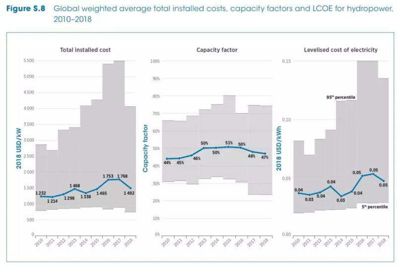 國際可再生能源署發(fā)布最新的可再生能源發(fā)電成本報告,2010-2018年全球水電項目加權平均的單位投資成本、容量系數(shù)、平準化成本走勢如下(以2018年美元計):