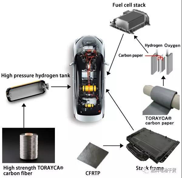 東麗(Toray)株式會社成立于1926年,是世界著名的以有機(jī)合成、高分子化學(xué)、生物化學(xué)為核心技術(shù)的高科技跨國企業(yè)。東麗為Mirai燃料電池系統(tǒng)提供了各種碳纖維材料,比如氫罐的高強(qiáng)度碳纖維、電堆中氣體擴(kuò)散層和汽車車身結(jié)構(gòu)方面的碳纖維增加塑料等。
