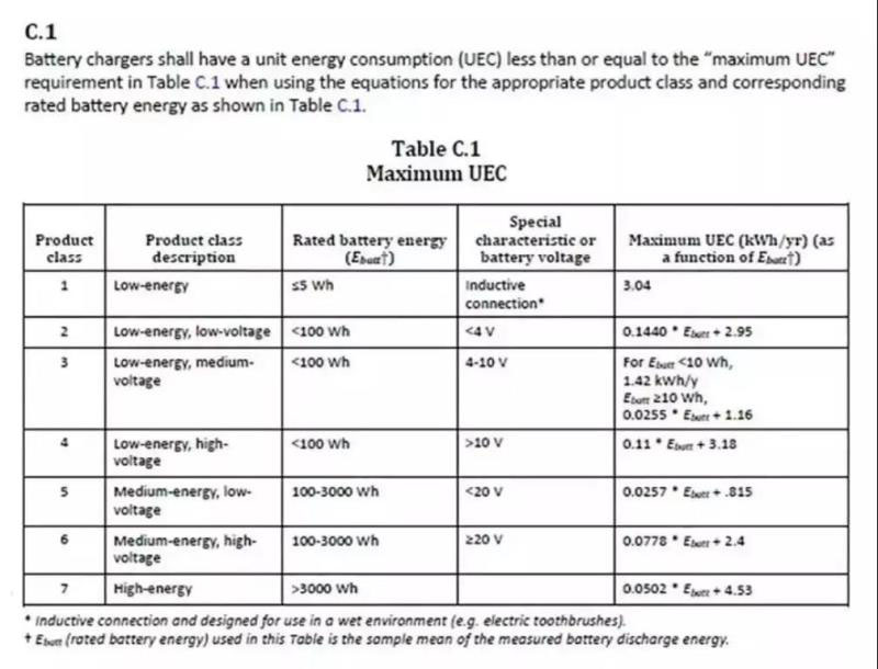 其中,需要注意的是:電池充電器的單位耗能必須小于或等于CSA C381.2-17中的下表的限值。