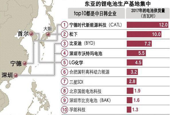 根據(jù)中國調(diào)查公司高工產(chǎn)業(yè)研究院(GGII)在2017年匯總的調(diào)查報告,中日韓三國企業(yè)壟斷了全球車載鋰離子電池供貨量排行榜前十。寧德時代新能源科技(CATL)以12吉瓦時排在榜首,該公司除向德國寶馬、德國大眾供應(yīng)電池外,2019年2月還宣布與本田進(jìn)行共同研發(fā)。