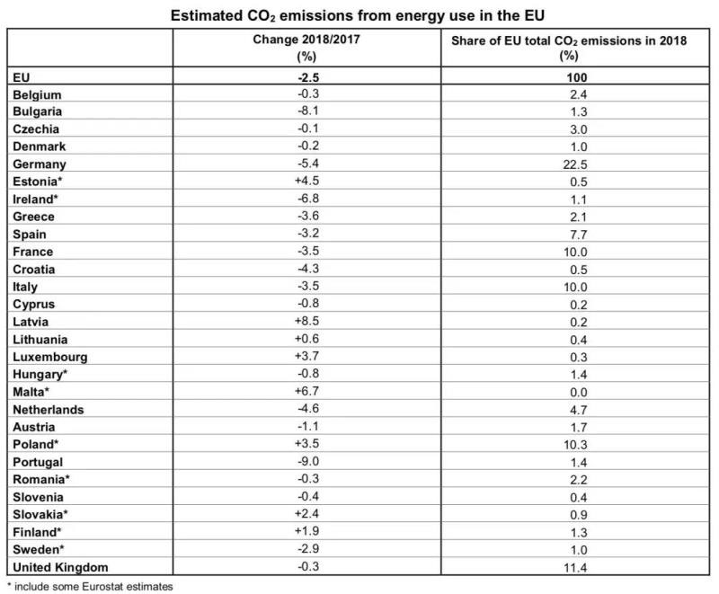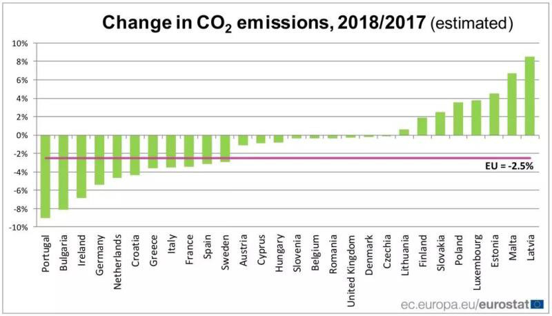 2018年歐盟成員國(guó)的二氧化碳排放量下降最多的國(guó)家是:葡萄牙(-9.0%)、保加利亞(-8.1%)、愛(ài)爾蘭(-6.8%)、德國(guó)(-5.4%)、荷蘭(-4.6%)、克羅地亞(-4.3%)。二氧化碳排放增加的國(guó)家是:拉脫維亞(+8.5%)、馬耳他(+ 6.7%)、愛(ài)沙尼亞(+4.5%)、盧森堡(+3.7%)、波蘭(+3.5%)、斯洛伐克(+2.4%)、芬蘭(+1.9%)和立陶宛(+0.6%)。