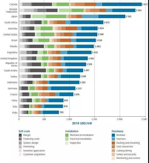 上圖的上半部分為2018年1月到7月的光伏制造業(yè)不同環(huán)節(jié)、不同生產(chǎn)地的成本。可以看到,光伏不同環(huán)節(jié)的成本在短短的半年中均出現(xiàn)了一定程度的下降。下部分為2013到2018年全球主要發(fā)展光伏的國(guó)家光伏組件的成本下降程度。