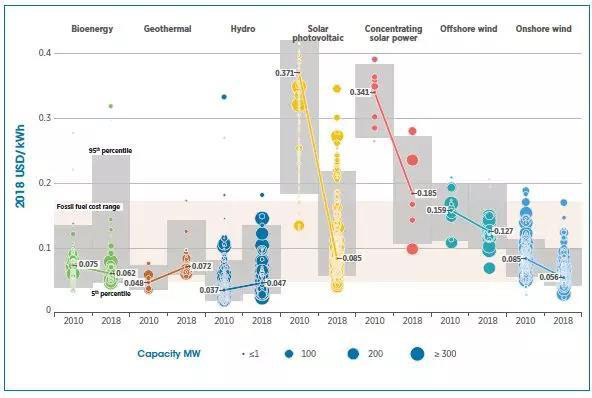 下圖把全球可再生能源2010年到2018年的平均平準(zhǔn)化成本可視化了,粉色區(qū)域?yàn)榈陀谧畋阋说幕茉窗l(fā)電的成本區(qū)間??梢钥吹?,經(jīng)過(guò)八年的發(fā)展,除了太陽(yáng)能光熱略高于化石能源的最低成本外,其他類型的可再生能源的全球平均平準(zhǔn)化成本已經(jīng)比可再生能源低。