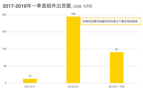 2019年一季度的組件出貨量已達(dá)到91MW,其組件需求可能有部分是用于去年10月份完成的標(biāo)案項(xiàng)目以及其他受到海外融資的項(xiàng)目需求。
