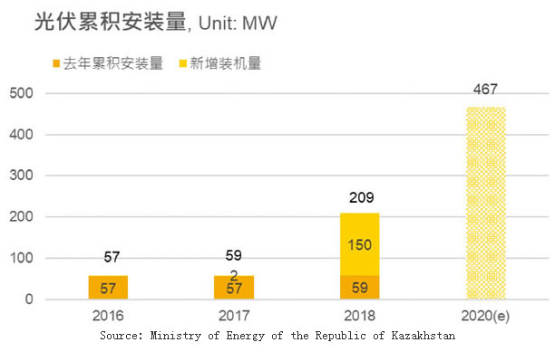 近年國(guó)際金融機(jī)構(gòu)(EBRD, CTF, ADB等)開(kāi)始挹注資金到哈薩克斯坦協(xié)助建造光伏項(xiàng)目,也使得政府開(kāi)始重拾發(fā)展光伏的動(dòng)力,裝機(jī)需求也開(kāi)始浮現(xiàn),截至2018年年底的累積安裝量已達(dá)到209MW,其中新增裝機(jī)量為150MW,是歷年來(lái)最高。