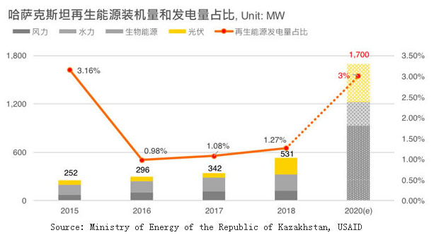 哈薩克斯坦的能源需求大部分來(lái)自于燃煤發(fā)電,近年政府積極推動(dòng)綠電發(fā)展致力實(shí)現(xiàn)2020年發(fā)電量目標(biāo),截至2018年年底,再生能源的發(fā)電量占比已達(dá)到1.27%,和2017年相比些微成長(zhǎng)0.19%。