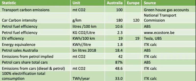 根據(jù)澳大利亞reneweconomy.com.cn網(wǎng)站的匯總,2018年澳大利亞交通領域碳排放、汽車油耗、電動車效率的關鍵數(shù)據(jù)如下: