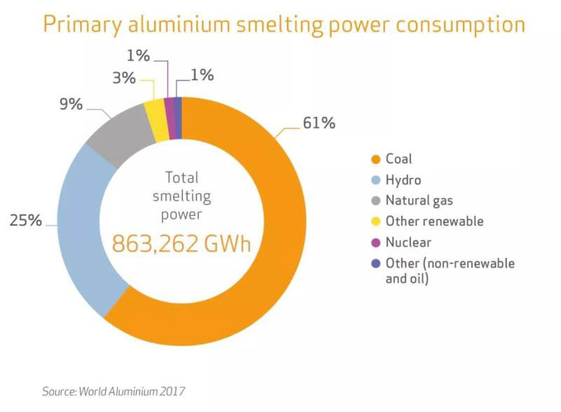 根據(jù)2017年世界鋁業(yè)報(bào)告,2017年全球制鋁耗電8632.62億度,主要來(lái)自煤電(61%)、水電(25%)、燃?xì)獍l(fā)電(9%)、非水可再生能源(3%)、核電(1%)以及其他(1%)。