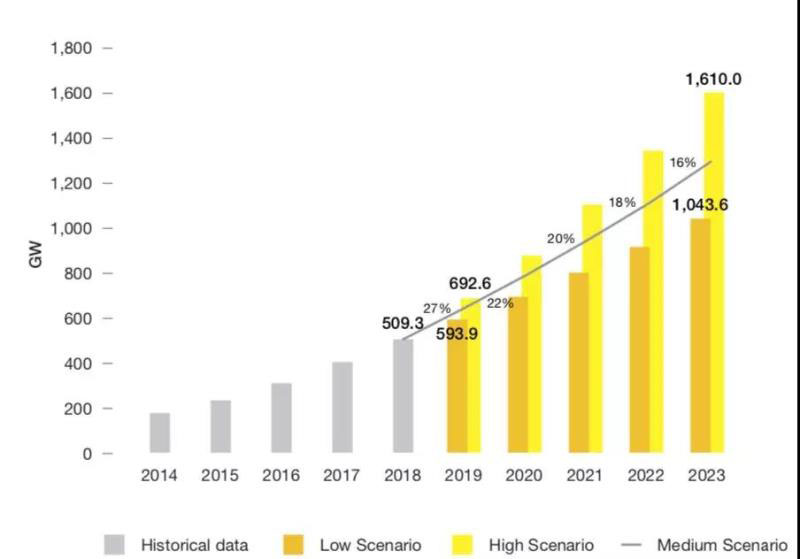 歐洲知名的太陽能機構(gòu)SolarPower Europe日前發(fā)布2019-2023全球太陽能市場展望報告稱,到2023年,全球太陽能市場總裝機容量有望達到1.3TW,預(yù)測期間將增加800GW裝機容量。