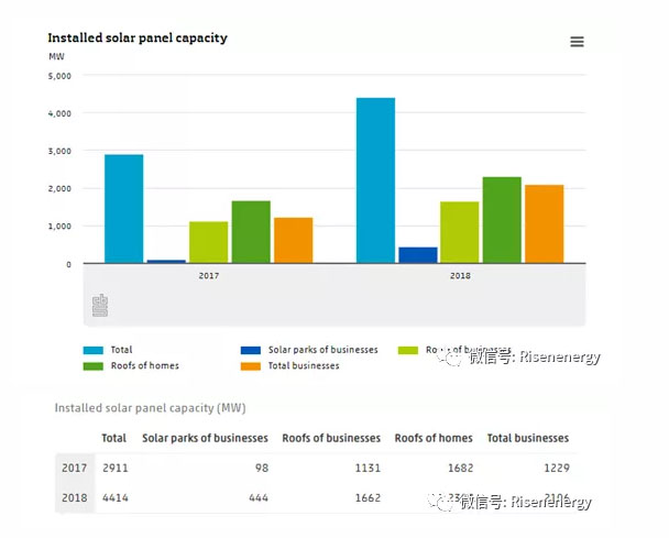 根據(jù)荷蘭中央統(tǒng)計局(CBS,Centraal Bureau voor de Statistiek)的數(shù)據(jù),荷蘭的太陽能裝機容量在2018年增加了1,500至4,414兆瓦,相比2017年增加了50%以上。其中包括2.3GW的個人屋頂光伏系統(tǒng)裝機量、0.44GW的大型太陽能電站,以及1.66GW的工商業(yè)屋頂電站系統(tǒng)。