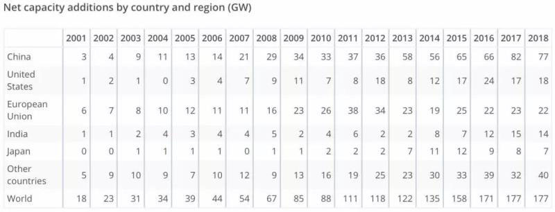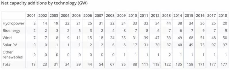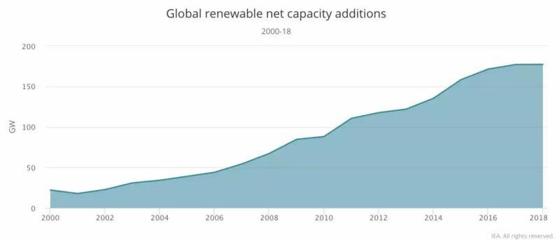 全球可再生能源發(fā)電裝機(jī)容量自2001年以來快速增長,至2017年每年新增裝機(jī)均超過上一年。但是,2018年全球新增可再生能源裝機(jī)177吉瓦,與2017年新增裝機(jī)持平,顯示全球可再生能源發(fā)電裝機(jī)的增長趨勢已經(jīng)放緩。
