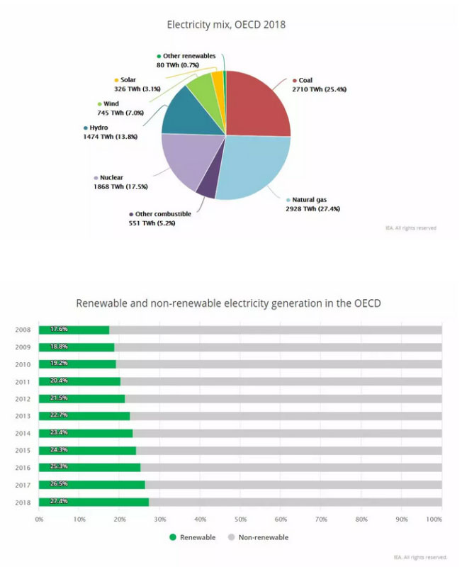 根據國際能源署最新數據,2018年經合組織36個成員國的發(fā)電結構中天然氣比例最高,達到27.4%,其次是煤電(25.4%)、核電(17.5%)、水電(13.8%)、風電(7.0%)、太陽能(3.1%)、其他燃料電源(5.2%)、其他可再生能源(0.7%)??傮w而言,2018年經合組織國家的可再生能源比例為27.4%,比2008年增長9.8個百分點;化石能源電源比例為52.8%。