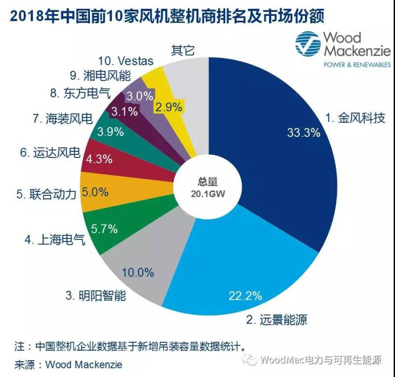 金風(fēng)科技與遠(yuǎn)景能源2018年中國(guó)市場(chǎng)份額總和超過(guò)55%,進(jìn)一步擠壓前十大整機(jī)企業(yè)的份額。