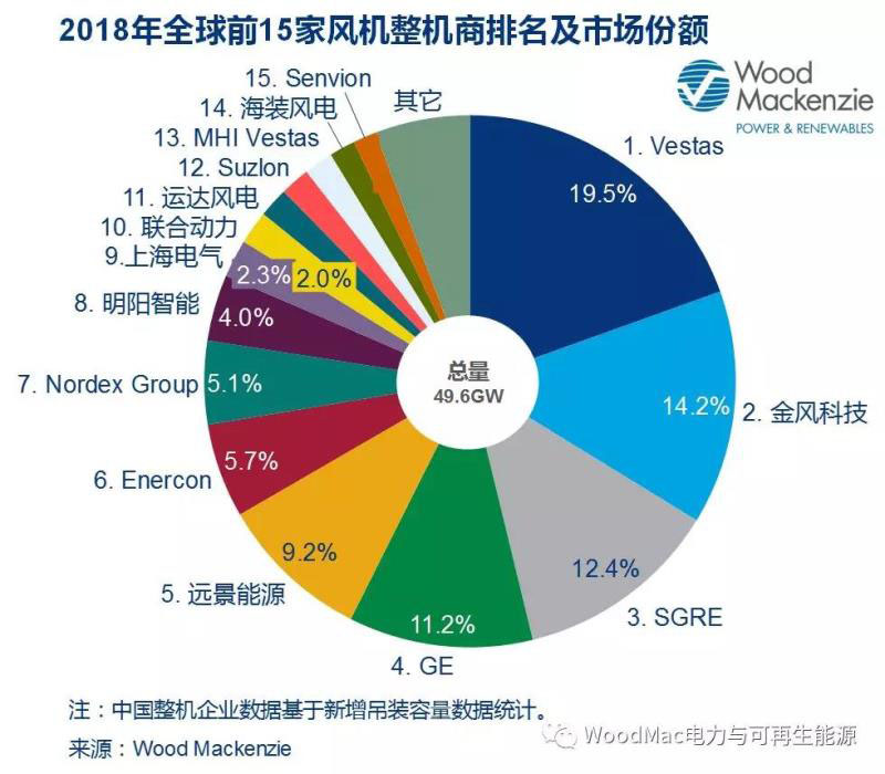 據(jù)Wood Mackenzie電力與可再生能源發(fā)布的最新報(bào)告《2018年全球風(fēng)機(jī)整機(jī)商市場(chǎng)份額》,2018年度,全球新增裝機(jī)容量為49.6GW,略低于2017年的數(shù)據(jù)52GW。Vestas、金風(fēng)科技與SGRE分別以19.5%、14.2%與12.4%的市場(chǎng)份額分列全球前三。
