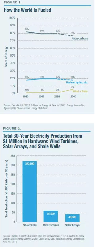 1)科學(xué)家尚未發(fā)現(xiàn)、企業(yè)家尚未發(fā)明任何與一種和化石能源(碳?xì)浠衔铮┮粯拥统杀尽⒏吣芰棵芏?、穩(wěn)定、安全和便捷的新能源。例如,公用事業(yè)規(guī)模的風(fēng)力渦輪機(jī)或太陽(yáng)能電池板上投入100萬(wàn)美元,經(jīng)過(guò)30多年的運(yùn)營(yíng),每年發(fā)電約5000萬(wàn)千瓦時(shí),而在頁(yè)巖鉆井平臺(tái)上花費(fèi)相當(dāng)于100萬(wàn)美元生產(chǎn)足夠的天然氣超過(guò)30年,發(fā)電超過(guò)3億千瓦時(shí)。