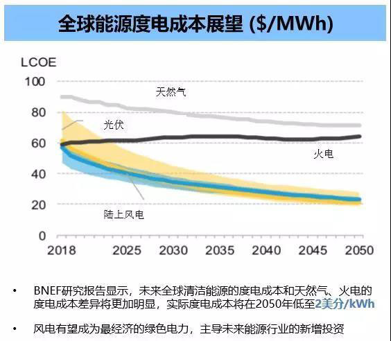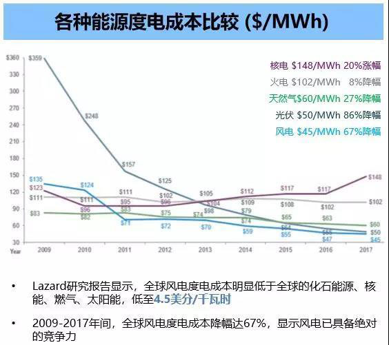 在今年金風(fēng)科技發(fā)布的報(bào)告中,與核電、火電、天燃?xì)?、光伏等能源形式相比,風(fēng)電的度電成本已經(jīng)極具競(jìng)爭(zhēng)力。截至2017年,全球風(fēng)電度電成本已經(jīng)低至4.5美分/千瓦時(shí)(折合人民幣0.30元/千瓦時(shí)),已具備絕對(duì)的競(jìng)爭(zhēng)力,并有望在2050年達(dá)到2美分/千瓦時(shí)(折合人民幣0.13元/千瓦時(shí))。