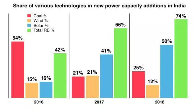 據(jù)BNEF統(tǒng)計數(shù)據(jù)顯示,印度近兩年內(nèi)可再生能源發(fā)電成本平均下降幅度達50%,并且預(yù)計還將持續(xù)下降。其中,新建的風(fēng)能、太陽能發(fā)電項目的批發(fā)電價,比印度現(xiàn)有燃煤電廠的電價平均低20%。2017年印度可再生能源的新增裝機首次超過煤電,印度的太陽能光伏市場翻了近一倍,新增光伏裝機容量達到9.4GW,占全國新增裝機的50%。
