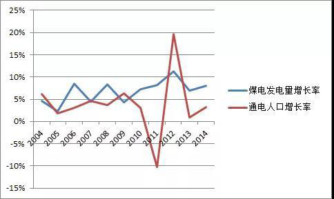 但是,在進入到解決無電人口的“最后五十米沖刺”的時候,煤電的高增長率并沒有帶來通電人口比例相同幅度的增長。從2004年到2014年煤電的發(fā)電量增長率和通電人口增長率的比較中可以看出,煤電的平均增長率在7%左右,而通電人口的增長率為4%,到2014年,印度依然有2.43億無電人口。