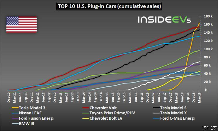 由于Model 3在2019年3月的高交付數(shù)據(jù),這助使其成為美國保有量最高的新能源汽車,排名其后的是雪佛蘭Volt和Model S。值得一提的是,雪佛蘭Volt盡管在美國取得了巨大的銷售成功,但官方已宣布于3月正式停產(chǎn)該車型,這也意味著,在新能源市場的競爭中,我們將不再看到它的身影。不過同處王者段位的日產(chǎn)聆風(fēng)依然步步緊追,以累計(jì)僅10萬輛的數(shù)量排名第四。