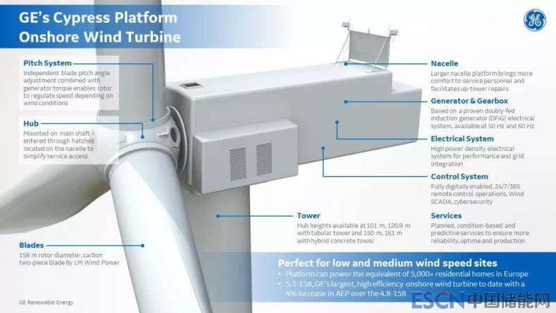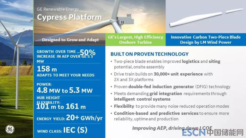 GE的Cypress平臺(tái)信息,相比3MW機(jī)型可提高50%年度發(fā)電量,風(fēng)輪直徑158米,從4.8到5.3MW,輪轂高度可從101米到161米,提高了靈活性。