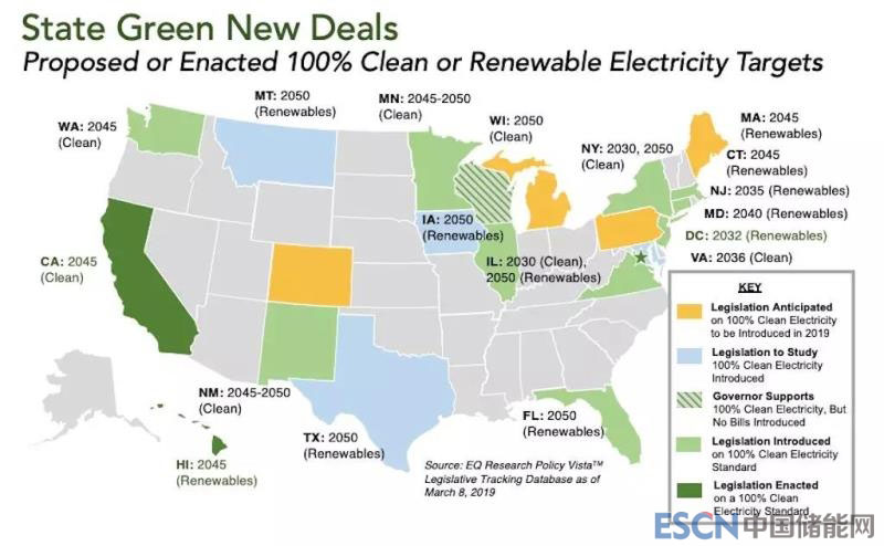 中國儲能網(wǎng)訊:美國民主黨在推動聯(lián)邦范圍內(nèi)的“綠色新政”(Green New Deal)前景不明朗,特朗普也時不時發(fā)推攻擊民主黨的“綠色新政”,但是美國很多州正在自己的范圍內(nèi)推動可再生能源發(fā)電的目標。如下圖所示,目前已經(jīng)有加利福尼亞州確立在2045年實現(xiàn)100%的清潔能源(包括核電、大型水電)、夏威夷州2045年實現(xiàn)100%可再生能源發(fā)電、華盛頓特區(qū)2032年實現(xiàn)100%可再生能源發(fā)電的目標。