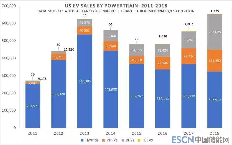中國儲能網(wǎng)訊:根據(jù)Auto Alliance/HIS Markit的數(shù)據(jù),2018年美國電動汽車市場銷量如下: