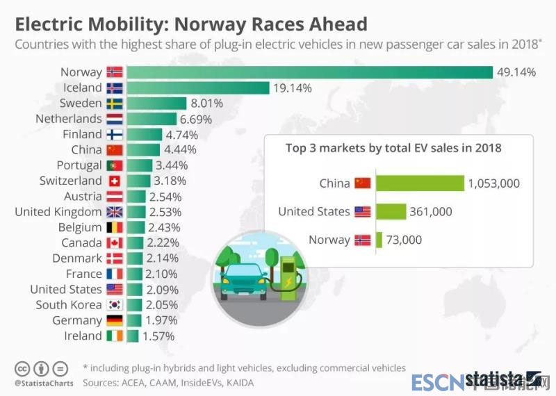 根據(jù)Statista網(wǎng)站匯總的數(shù)據(jù),2018年電動汽車最大的市場是中國(新售出105.3萬輛)、美國(36.1萬輛)、挪威(7.3萬輛)。但是,如果從電動汽車在當(dāng)年整體新車市場所占的比例來看,挪威遙遙領(lǐng)先(49.1%),其次是冰島(19.14%)、瑞典(8.01%)、荷蘭(6.69%)、芬蘭(4.74%)。中國電動汽車銷售總量雖然遙遙領(lǐng)先,但是電動汽車在新車市場所占比例僅為4.44%,排在第6位。