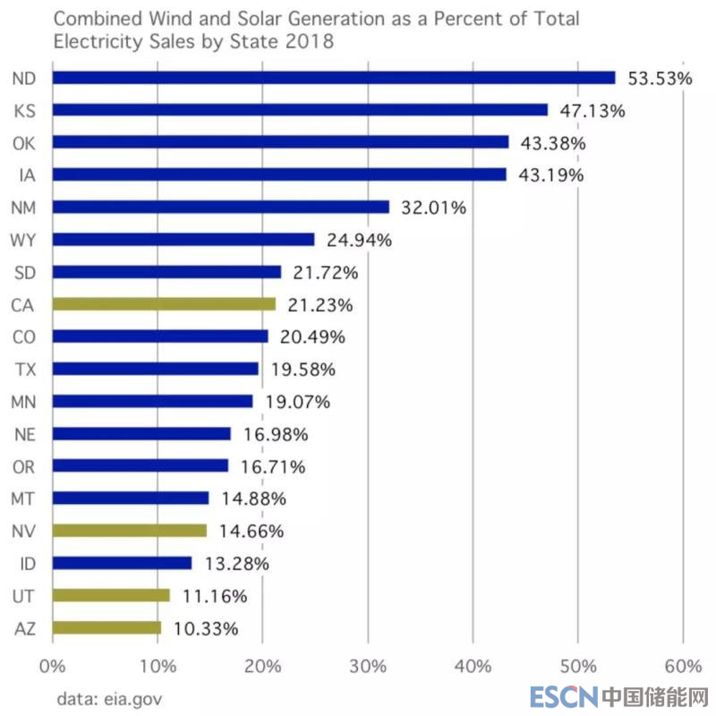 2018年美國(guó)已經(jīng)有18個(gè)州的風(fēng)電、光伏發(fā)電比例超過了10%,分別是:1)北達(dá)科他州(53.53%)、2)堪薩斯州(47.13%)、3)俄克拉荷馬州(43.38%)、4)愛荷華州(43.19%);5)新墨西哥州(32.01%);6)懷俄明州(24.94%);7)南達(dá)科他州(21.72%);8)加利福尼亞州(21.23%);9)科羅拉多州(20.49%);10)得克薩斯州(19.58%);11)明尼蘇達(dá)州(19.07%);12)內(nèi)布拉斯加州(16.98%);13)俄勒岡州(16.71%);14)蒙大拿州(14.88%);15)內(nèi)華達(dá)州(14.66%);16)愛達(dá)荷州(13.28%);17)猶他州(11.16%);18)阿利桑那州(10.33%)。