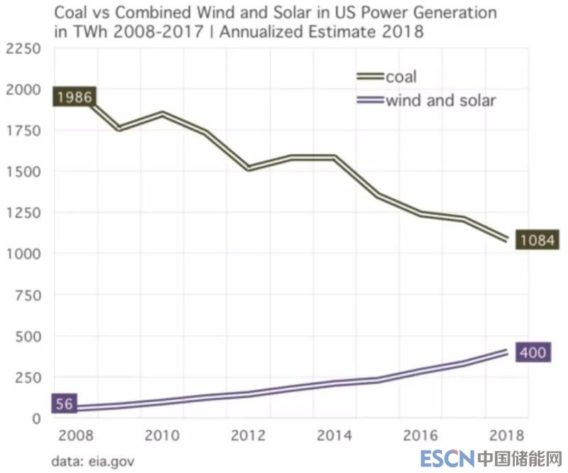 2018年美國(guó)風(fēng)電、光伏發(fā)電量約為4000億千瓦時(shí)(400 TWh),是2008年(56 TWh)的7.1倍;而2008年煤電發(fā)電量為10840億千瓦時(shí)(1084TWh),是2008年(1986TWh)的54.5%。
