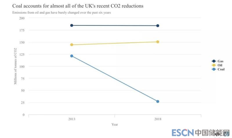英國(guó)碳排放水平的大幅度下降主要是因?yàn)槿ッ夯慕Y(jié)果。2013年至2018年期間英國(guó)碳排放下降9800萬(wàn)噸,其中97%(9400萬(wàn)噸)源于煤炭消費(fèi)的下降。2018年英國(guó)煤電只占發(fā)電量的5%,而英國(guó)已經(jīng)確定到2025年煤電完全退出。