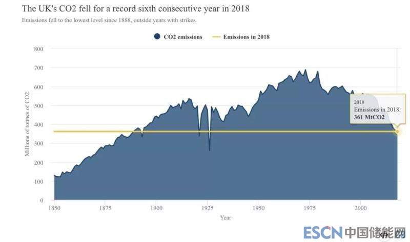 中國(guó)儲(chǔ)能網(wǎng)訊:根據(jù)英國(guó)Carbon Brief機(jī)構(gòu)的評(píng)估,英國(guó)2018年碳排放為3.61億噸,比1973年的排放峰值6.88億噸下降47.5%,相當(dāng)于1889年的排放水平。從人均碳排放水平來(lái)看,2018年英國(guó)人均碳排放為5.4噸,是1858年以來(lái)的最低水平。