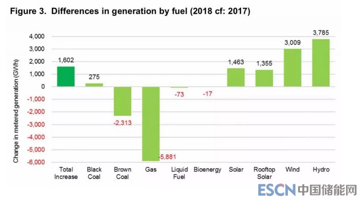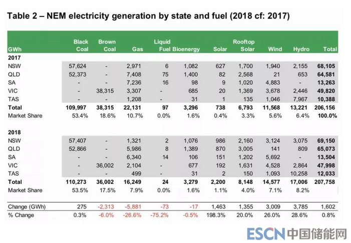 中國(guó)儲(chǔ)能網(wǎng)訊:2018年澳大利亞發(fā)電量為2077.58億千瓦時(shí),其中煤電71.0%、天然氣7.9%、水電8.2%、風(fēng)電7.1%、光伏5.1%(屋頂光伏4.0%)、生物質(zhì)1.6%。雖然化石能源仍接近80%,但是發(fā)電量已經(jīng)比2017年明顯下降,而光伏、風(fēng)電、水電快速增長(zhǎng)。