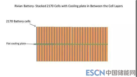 Rivian的動(dòng)力電池模組采用了上下兩層的結(jié)構(gòu),總共由864個(gè)電池單體組成,每層放置432個(gè)單體,其熱管理系統(tǒng)的解決方案是在兩層電池單體之間放置一塊7mm厚的冷卻板,泠卻液在內(nèi)部循環(huán),從而達(dá)到控制動(dòng)力電池工作溫度的作用。