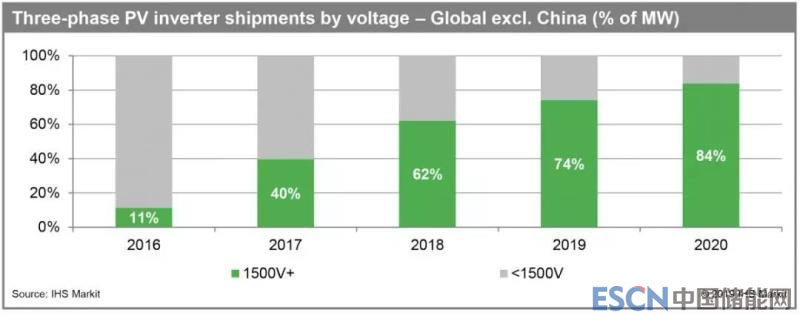 伴隨1500V系統(tǒng)在全球光伏市場的攀升,1500V逆變器出貨量借勢“水漲船高”。IHS報告顯示,在2017年除中國外的全球光伏市場上,三相逆變器出貨中的40%為1500V,2018年這一比例已提升至62%,全面超越1000V。IHS預計,2019年1500V三相逆變器份額將繼續(xù)增至74%,2020年則飆升到84%。