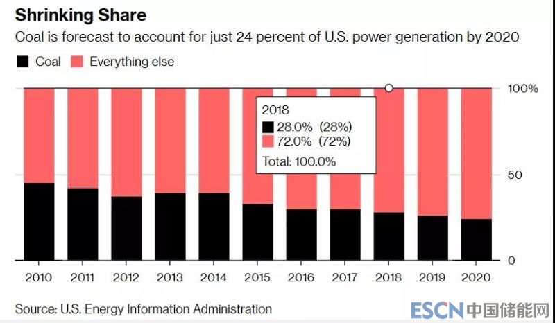 中國儲能網(wǎng)訊:根據(jù)彭博社轉(zhuǎn)引美國能源信息署的數(shù)據(jù),2010年美國煤電比例為45%,此后逐年下降。2017年煤電比例為30%,2018年進一步下跌至28%。2018年美國有18座煤電廠退役,創(chuàng)造歷史上煤電退役的最高水平;預(yù)計2019年仍將有14座煤電廠退役。美國能源信息署預(yù)測,2020年美國煤電比例僅剩24%。