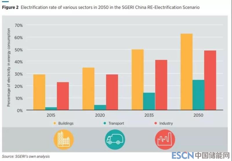 在中國(guó),國(guó)家電網(wǎng)能源研究所(SGERI)的研究表明,中國(guó)最終能源使用總量中的電力份額可能會(huì)從目前的21%增長(zhǎng)到2050年的47%。2015年至2050年能源使用總量將增加約30%,而電力消耗將增長(zhǎng)140%。同時(shí)中國(guó)電力供應(yīng)將發(fā)生結(jié)構(gòu)性的改變,到2050年可再生能源將提供66%的發(fā)電(太陽(yáng)能光伏和風(fēng)力發(fā)電占41%)。建筑物的再電氣化可能性特別高,預(yù)計(jì)到2050年電力在建筑能源消耗中的份額將從目前的29%增加到63%;工業(yè)和運(yùn)輸部門(mén)能耗的電力份額將分別達(dá)到49%和25%。