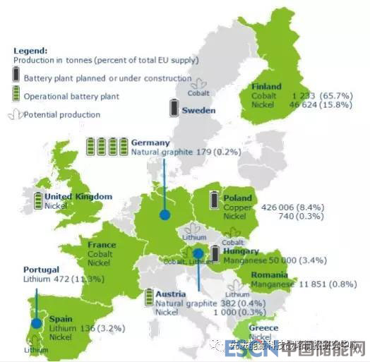 加工和冶金:2010至2014年間,世界精煉鈷年平均產(chǎn)量約為8.34萬(wàn)噸,中國(guó)是精煉鈷的主要生產(chǎn)國(guó)。歐盟精煉鈷主要依靠?jī)?nèi)部生產(chǎn)和從17個(gè)國(guó)家進(jìn)口鈷礦石,其主要生產(chǎn)國(guó)為芬蘭(占全球產(chǎn)量13%)、比利時(shí)(5%)和法國(guó)(<1%)。2010年至2014年間,歐盟年平均進(jìn)口的鋰化合物約含有3600噸鋰金屬,葡萄牙和西班牙年生產(chǎn)約600噸鋰化合物,不用于出口。2010至2014年間全球鎳金屬年平均產(chǎn)量為175萬(wàn)噸,中國(guó)是精煉鎳的最大生產(chǎn)國(guó)。歐盟的芬蘭、法國(guó)和英國(guó)生產(chǎn)精煉鎳。中國(guó)生產(chǎn)全世界70%的天然石墨,其中70%是無(wú)定形石墨、30%是片狀石墨。