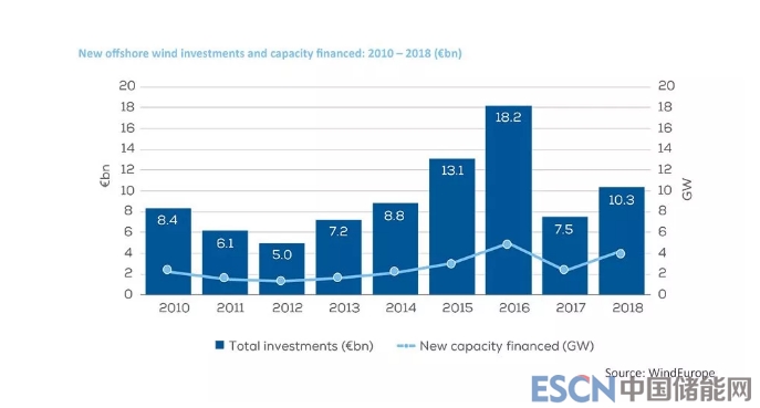 另外還有12個新的海上風(fēng)電項目于2018年達(dá)成最終投資決策,這意味著產(chǎn)能將進一步增加4.2吉瓦,投資額將達(dá)到103億歐元。2018年的海上風(fēng)電投資數(shù)據(jù)同樣增長,較之2017年的水平增長了37%,但促進產(chǎn)能增加的資金增長了86%,這表明成本下降的速度和每單元投資可以產(chǎn)生的容量。