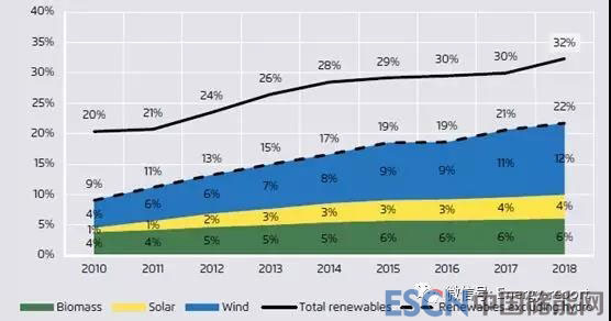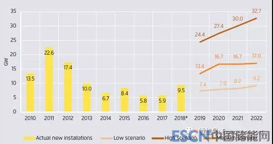 風(fēng)電很強(qiáng),但是光伏已經(jīng)做好準(zhǔn)備!2018年,可再生能源在歐盟發(fā)電量中占比上升至32.3%。雖然今年的增長主要是由于風(fēng)電發(fā)電量增長有所回升以及水電發(fā)電量恢復(fù)正常,但是光伏是2018年真正的“熱門”:2018年歐洲光伏新增裝機(jī)容量或?qū)⑼仍鲩L60%以上,達(dá)到近1000萬千瓦,到2022年裝機(jī)容量可能增加兩倍,達(dá)到3000萬千瓦。2018年,組件價(jià)格同比下跌29%。在2018年夏季“熱浪”中,光伏的表現(xiàn)超過了煤電、核電、風(fēng)電和水電。2018年,意大利、法國和西班牙分別起草了大膽的國家太陽能發(fā)展計(jì)劃(2030年)。2018年歐盟商定的2030年可再生能源目標(biāo)將帶來更多成果。