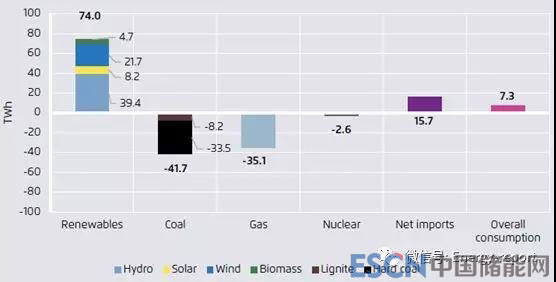 煤電和氣電的燃料和碳成本首次與風(fēng)電和光伏的完全成本相當(dāng)。2018年煤電和氣電成本上升:煤價(jià)同比上漲15%,天然氣價(jià)格同比上漲30%,二氧化碳價(jià)格同比上漲170%。因此,歐洲的電價(jià)升至45~60歐元/兆瓦時(shí)。這個(gè)價(jià)格水平與德國最新的風(fēng)電和光伏拍賣價(jià)格相當(dāng)。