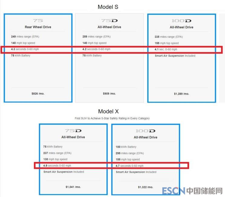 中國儲能網(wǎng)訊:日前,我們從海外媒體獲悉,特斯拉將為旗下車型再次升級動力系統(tǒng)。具體升級信息為MODEL S 75的0-96km/h加速成績從5.5秒升級為4.3秒,MODEL S 75D從5.2秒升級為4.2秒,MODEL S 100D從4.2秒升級為4.1秒,MODEL X 75D從之前的6.0秒升級為4.9秒,MODEL X 100D從之前的5.2秒升級為4.7秒。需要注意的是,本次升級僅針對未售車型,已售車型將不在升級范圍內(nèi)。