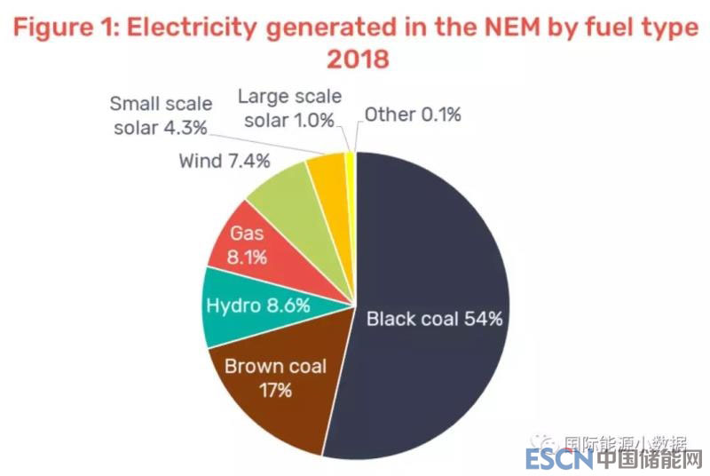 中國儲能網訊:根據澳大利亞電力市場匯總的初步數據,2018年澳大利亞國家電力市場(NEM)煤電占比71%(其中硬煤占54%、褐煤17%),其次為水電(8.6%)、天然氣(8.1%)、風電(7.4%)、太陽能5.3%(其中小型光伏4.3%、大型光伏1.0%)。