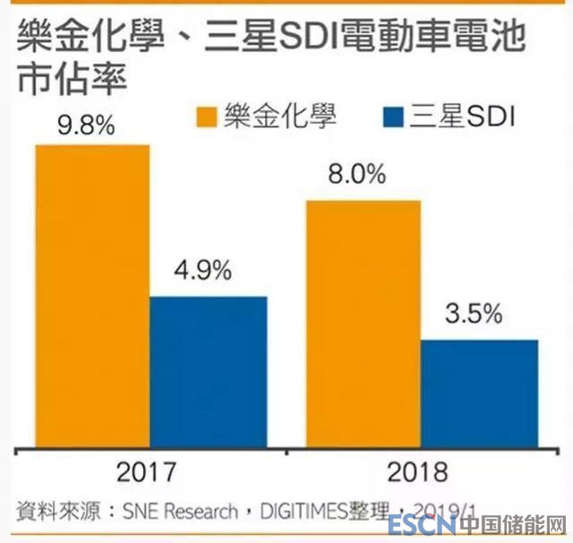 韓媒DigitalTimes引述市調(diào)機(jī)構(gòu)SNE Research最新公布的資料,指出如以2018年11月底為基準(zhǔn),2018年全球電動(dòng)汽車(chē)電池出貨量排名,樂(lè)金化學(xué)、三星SDI市占率分別為8.0%及3.5%,相較2017年同期的9.8%與4.9%,分別減少1.8個(gè)及1.4個(gè)百分點(diǎn)。