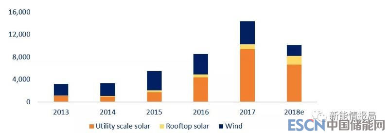 中國(guó)儲(chǔ)能網(wǎng)訊:根據(jù)Bridge to India發(fā)布的數(shù)據(jù),2018年印度公用事業(yè)光伏裝機(jī)下降了29%,但是屋頂光伏裝機(jī)增長(zhǎng)了73%。