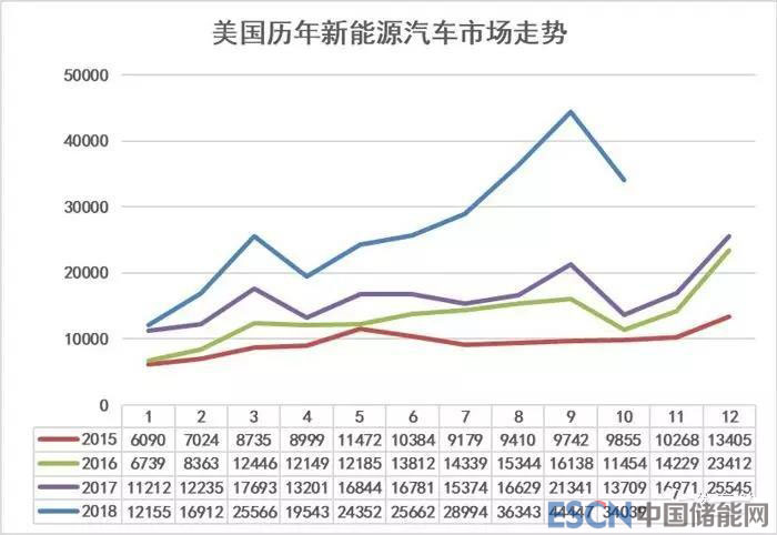 自2011年1月以來(lái),美國(guó)市場(chǎng)已累計(jì)售出超過(guò)99萬(wàn)輛電動(dòng)汽車(chē),而僅在2018年第三季度就銷(xiāo)售了11萬(wàn)輛電動(dòng)汽車(chē),與2017年同期相比顯著增長(zhǎng)了108%。從下圖2015年以來(lái)的美國(guó)新能源汽車(chē)走勢(shì),也可以看到,當(dāng)?shù)匦履茉词袌?chǎng)并未停滯。