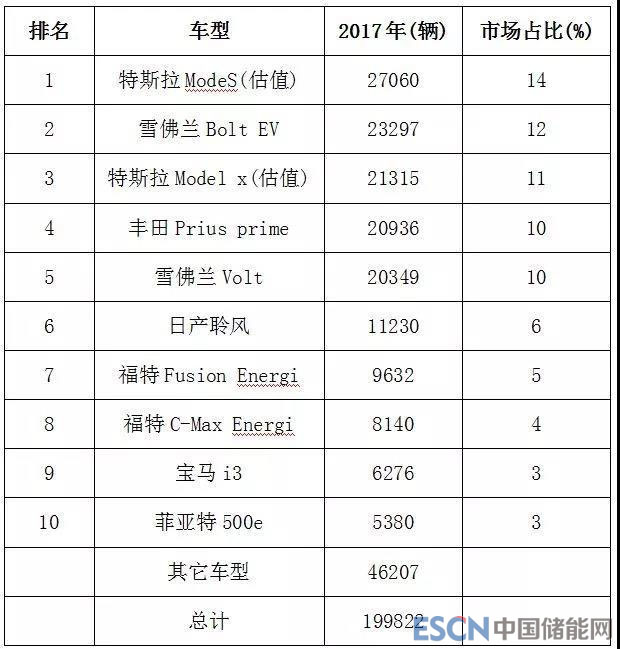 以美國(guó)2017年新能源汽車(chē)銷(xiāo)量前十為例。