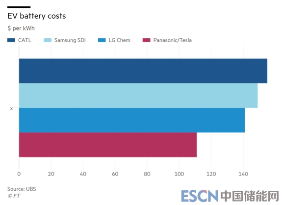 瑞銀分析師Colin Langan表示,對特斯拉/松下、LG化學(xué)、三星SDI以及寧德時(shí)代(CATL)生產(chǎn)的鋰離子電池進(jìn)行拆解分析,特斯拉/松下的21700型圓柱形鋰離子電池的成本為111美元/kWh,比LG化學(xué)公司的148美元/kWh低37美元,擁有明顯的成本優(yōu)勢。而目前寧德時(shí)代的成本超過150美元/kWh,稍遜于三星SDI名列第四名。