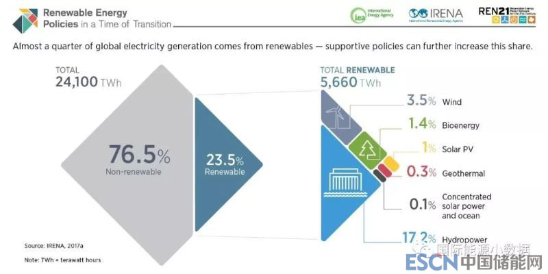中國(guó)儲(chǔ)能網(wǎng)訊:根據(jù)國(guó)際可再生能源署(IRENA)的數(shù)據(jù),2017年全球發(fā)電量24萬億千瓦時(shí),其中23.5%來自可再生能源電源(5.66萬億千瓦時(shí))。