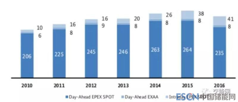 直到2016年,德國(guó)日內(nèi)市場(chǎng)交易量不斷上升,2016年達(dá)到41TWh,。2016年基礎(chǔ)負(fù)荷小時(shí)產(chǎn)品平均價(jià)格為每兆瓦時(shí)37.52歐元,高峰負(fù)荷小時(shí)產(chǎn)品平均價(jià)格為45.24歐元。