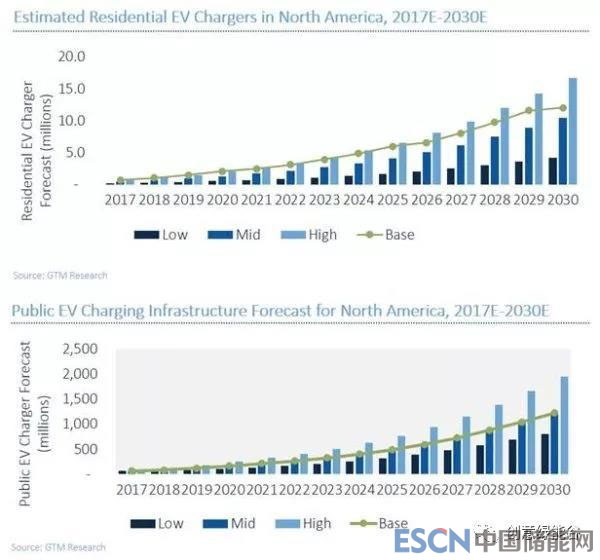 報告稱,到2030年僅在北美將安裝額外的1200萬個住宅充電點(diǎn)。與此同時,在歐洲市場,將有900萬個充電點(diǎn)安裝在私人家庭中。而公共充電基礎(chǔ)設(shè)施方面,GTM Research估計歐洲將安裝160萬個,而北美約為120萬個。